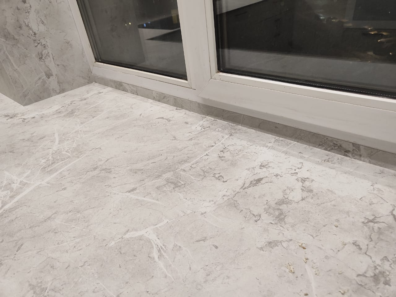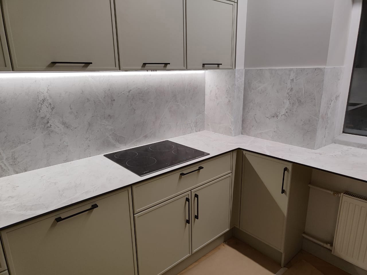 Прямая столешница и стеновая панель на кухню в один цвет из hpl компакт пластика под камень Arcobaleno жемчужный перито под ключ