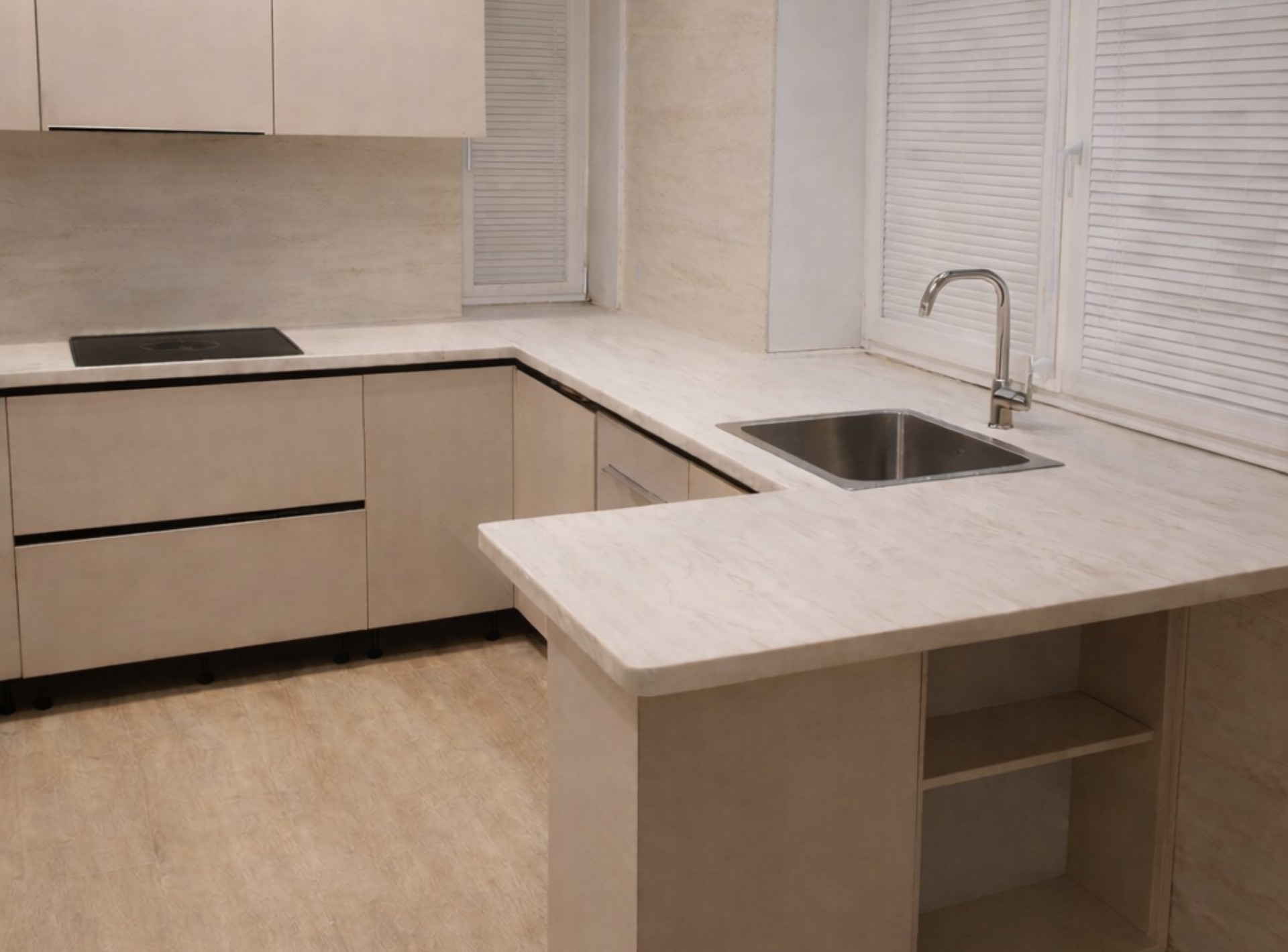 Мойка будет из того же материала, что и столешница, без видимых швов и стыков.