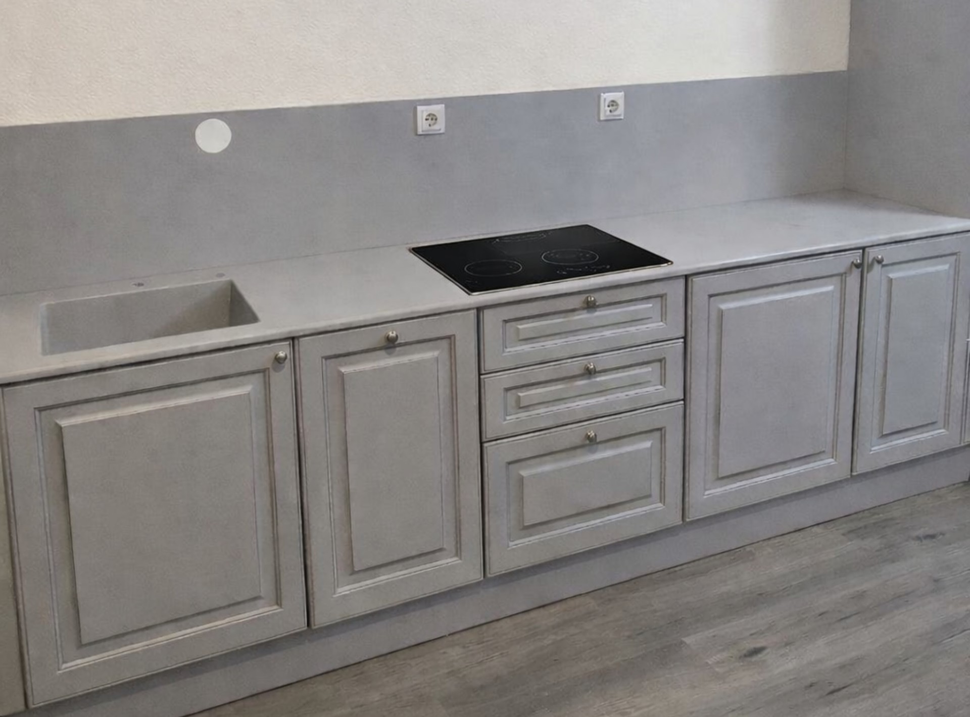 В другом — только простые вырезы под накладную мойку и варочную панель.